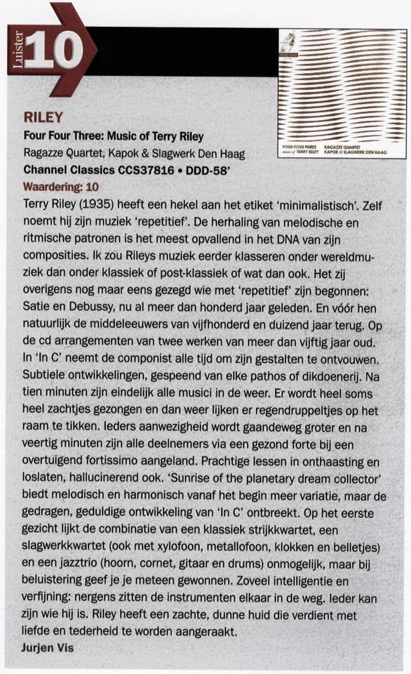 “Prachtige lessen in onthaasting en loslaten, hallucinerend ook. (…) Zoveel intelligentie en verfijning: nergens zitten de instrumenten elkaar in de weg.” (Review in Dutch by Jurjen Vis for Luister magazine.)