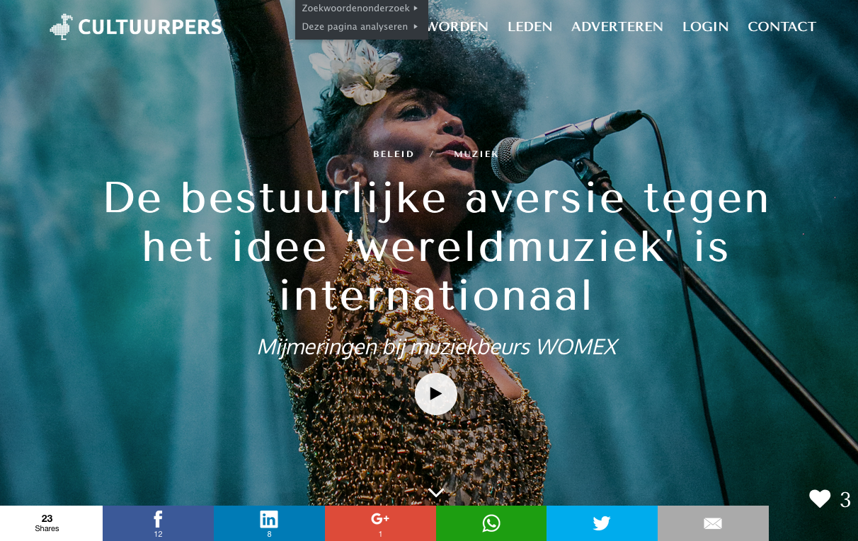 Vanaf vandaag schrijf ik ook voor het Cultureel Persbureau, de website van een coöperatie van cultuurjournalisten. Eerste stuk naar aanleiding van de jaarlijkse wereldmuziekconferentie WOMEX en wat omvallende zalen.