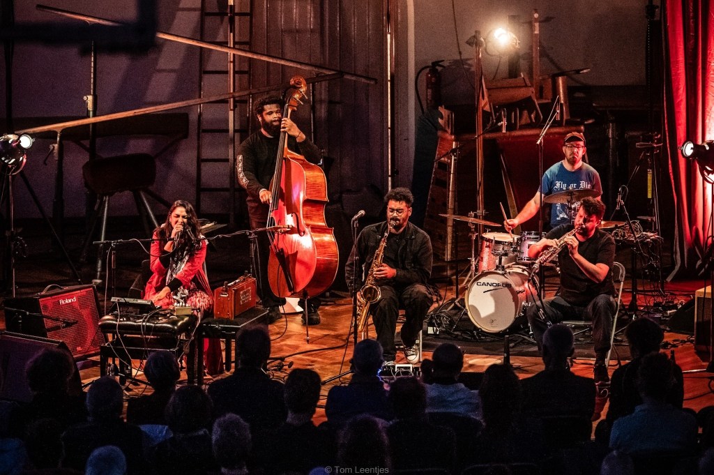 Amirtha Kidambi’s Elder Ones played in the historical gym room in Bruges, powered by KAAP, friday May 24th 2024. Nicolas Mortelmans Quartet presented their W.E.R.F. Records debut before Kidambi.